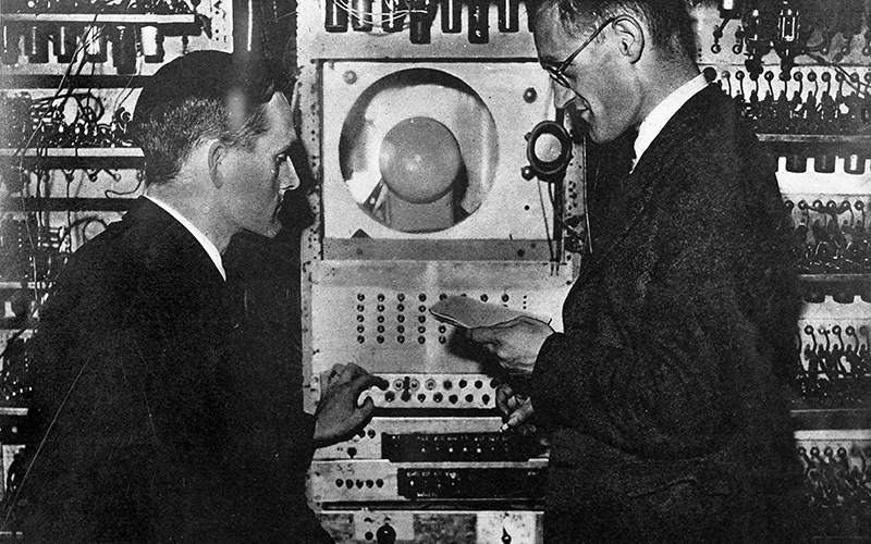 Dai Edwards and Tommy Thomas using the Manchester Mark 1 computer.